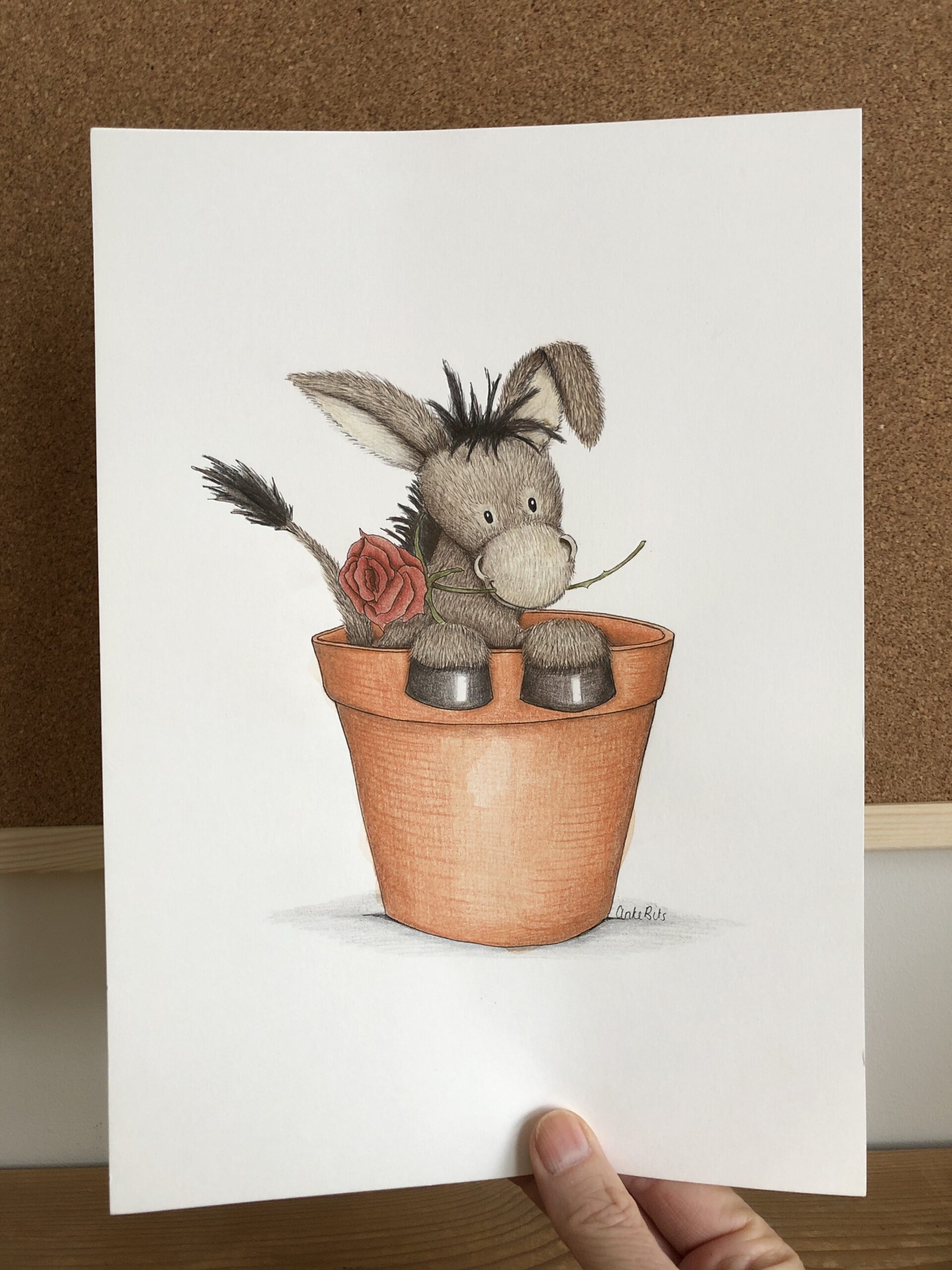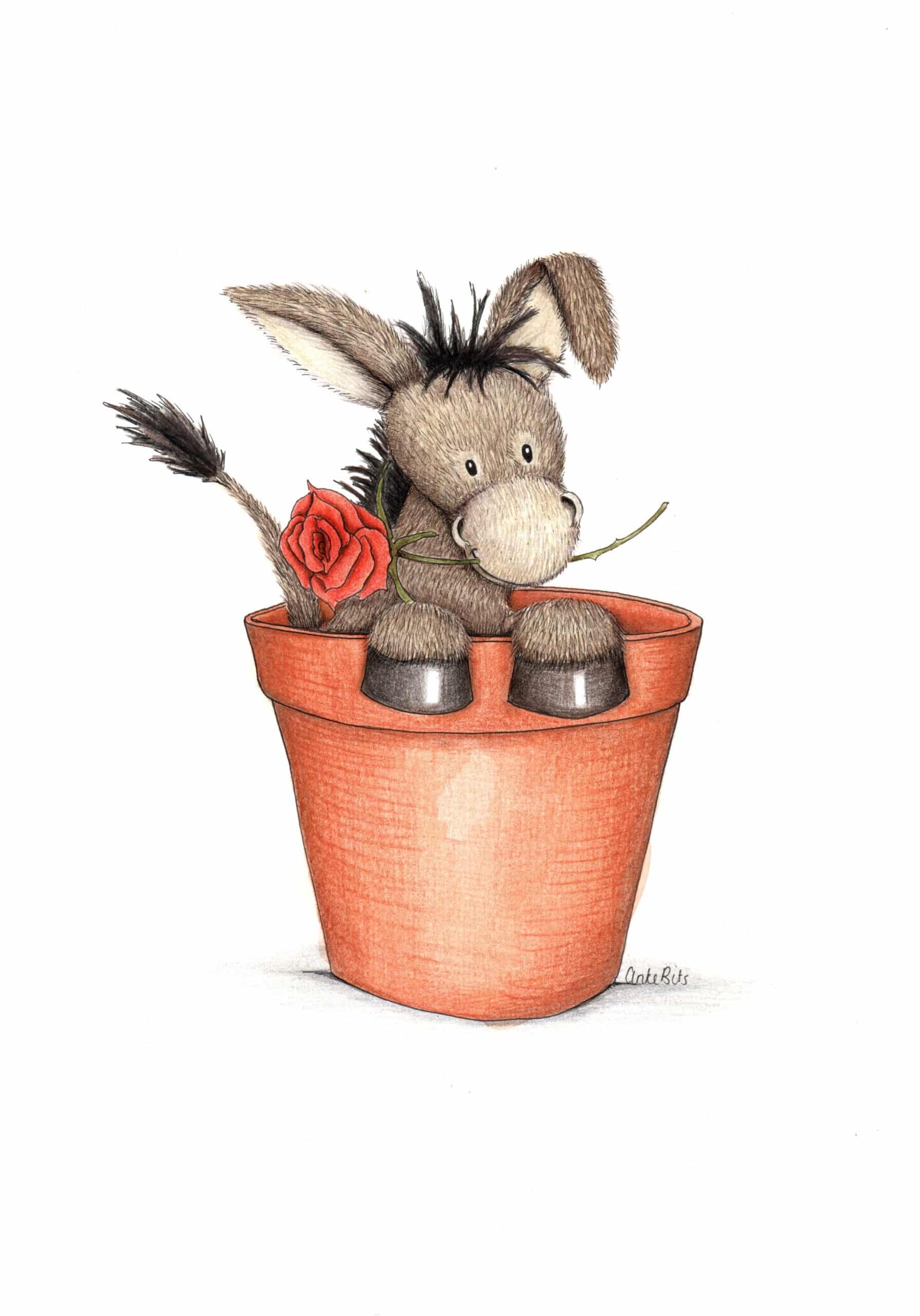 Deze originele illustratie ezeltje met roos is gemaakt met potlood en pen op tekenpapier. Laagje voor laagje ingekleurd en streepje voor streepje is de vacht getekend. Het is de enige echte, meer van deze zijn er niet en zullen er ook niet komen.