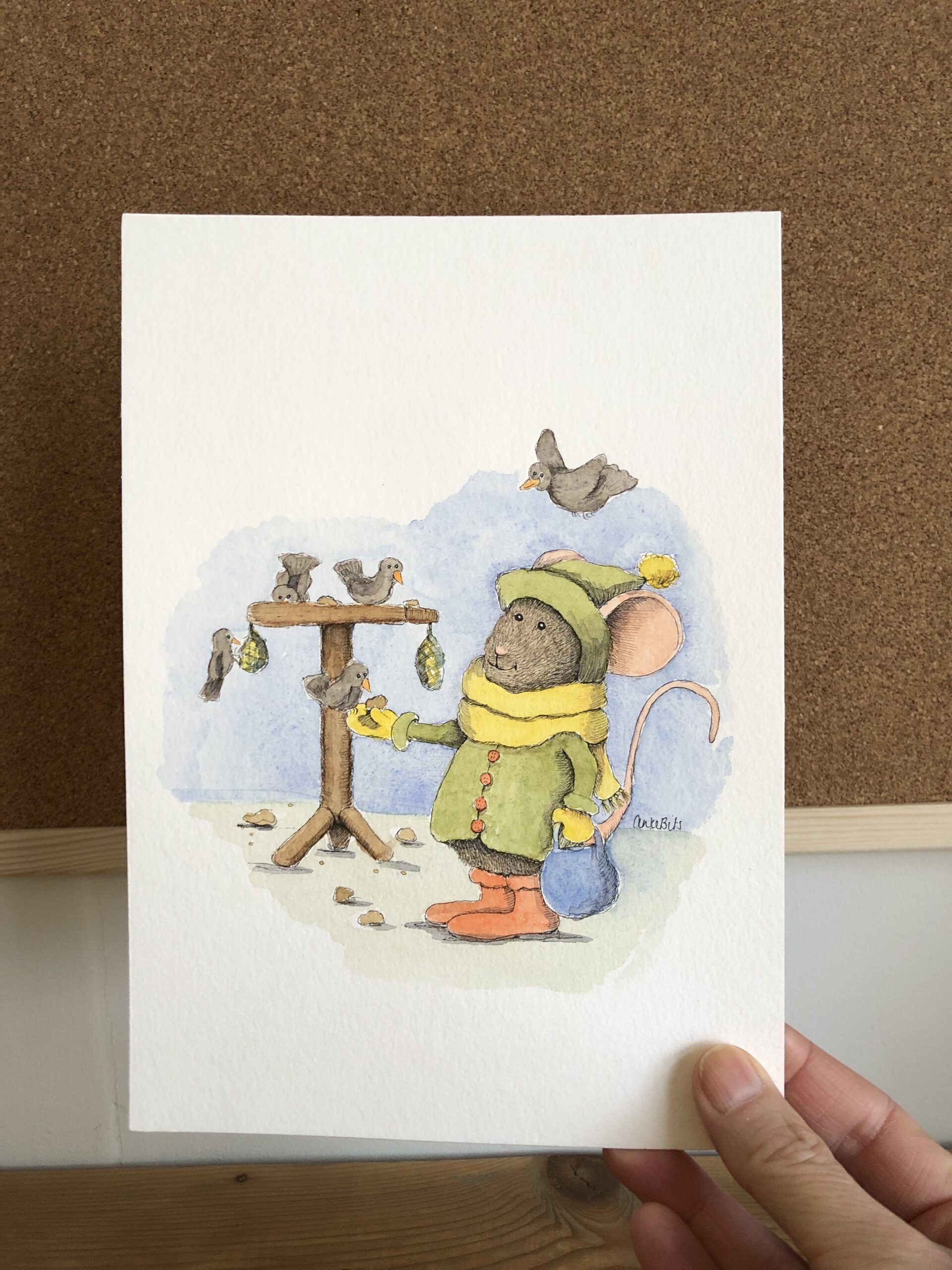 Deze originele illustratie is gemaakt met aquarel en pen op aquarel papier met weinig structuur. Door gebruik te maken van ‘koele’ kleuren heeft hij meer een winterse uitstraling. Maar bovenal is hij natuurlijk vooral schattig.