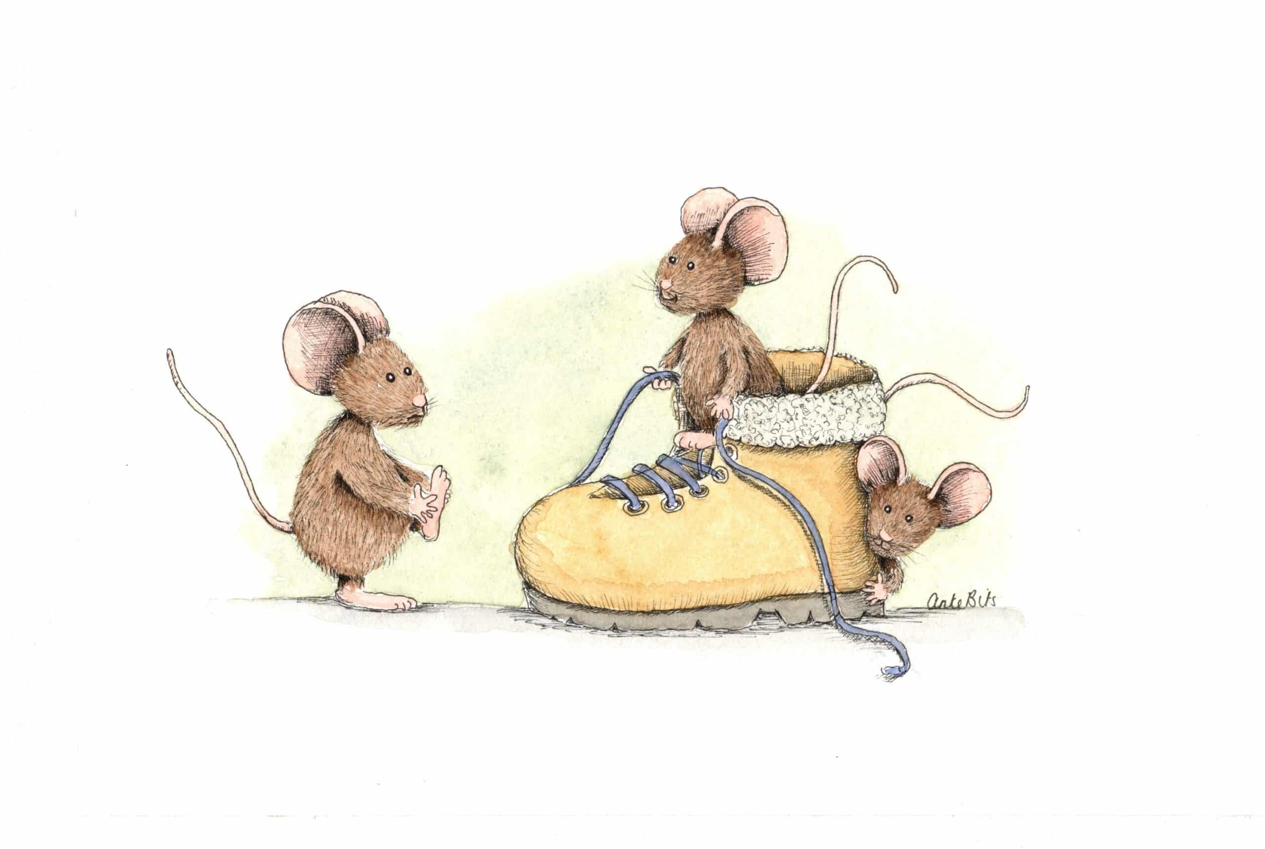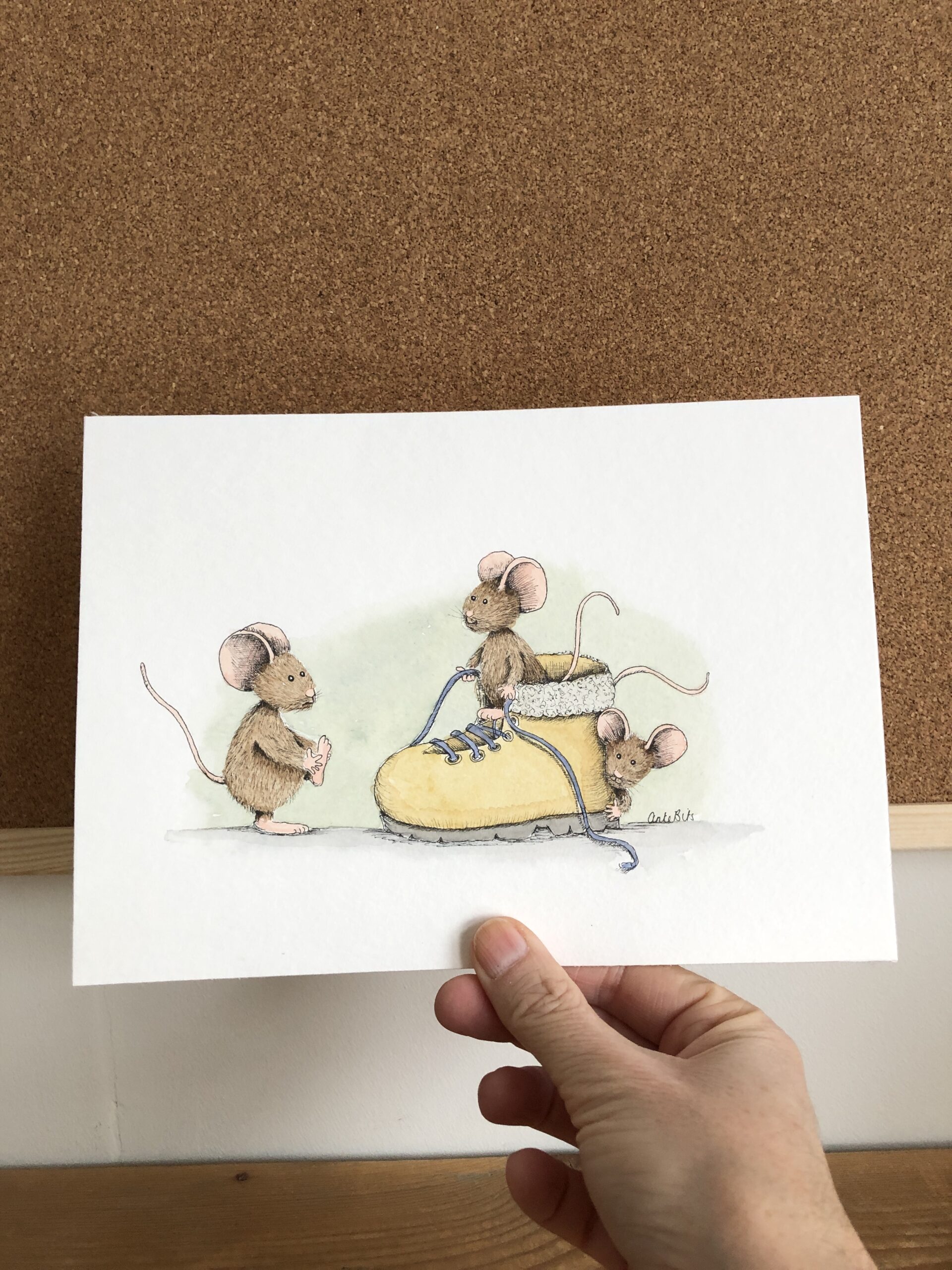 Deze originele illustratie wie de schoen past is gemaakt op glad aquarelpapier. Met pen en aquarel is de illustratie uitgewerkt waardoor er een zachte en lieflijk effect ontstaat.